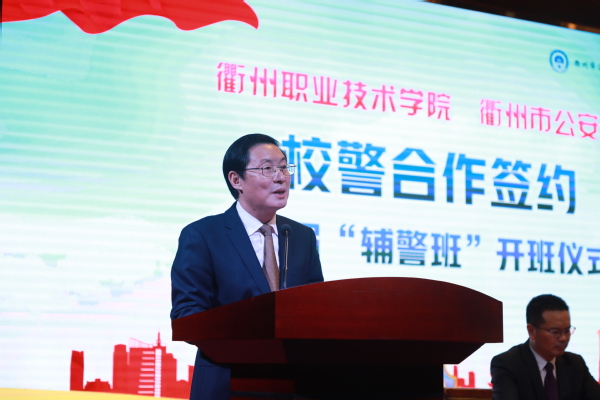 王顺大讲话。他说,首届“辅警班”将就人才培养、基地建设、技术研发、职业技能培训等方面达成战略合作关系。他表示,衢州市公安系统将从身份认同、待遇提升、发展空间拓展等三方面对辅警正规化运作进行顶层化设计,以确保辅警班招录有制度保障。他认为,我校作为全日制高等学校,学生有学历优势;学校近几年在全省高校体能测试中均位全省前五,学生有身体优势;学校开设了无人机、机械制造、网络信息化技术等警务技术相关专业,学生有专业技术优势;学校学风班风良好,有纪律作风优势,这些优势都十分有利于辅警队伍的履职和队伍建设。对于下一步的合作,他希望进一步扩大招生规模,进一步加强就业保障,进一步扩大合作范围,让首届“辅警班”成为可复制可推广的衢州样板。
